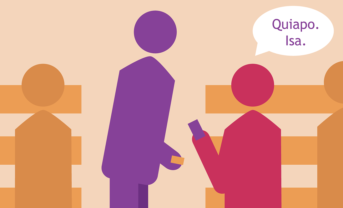 Raise a hand to hail down your chosen bus. Board and try to look for a seat as you traverse the aisle. Sorry, no time to do surveillance. If none are available, just stand.